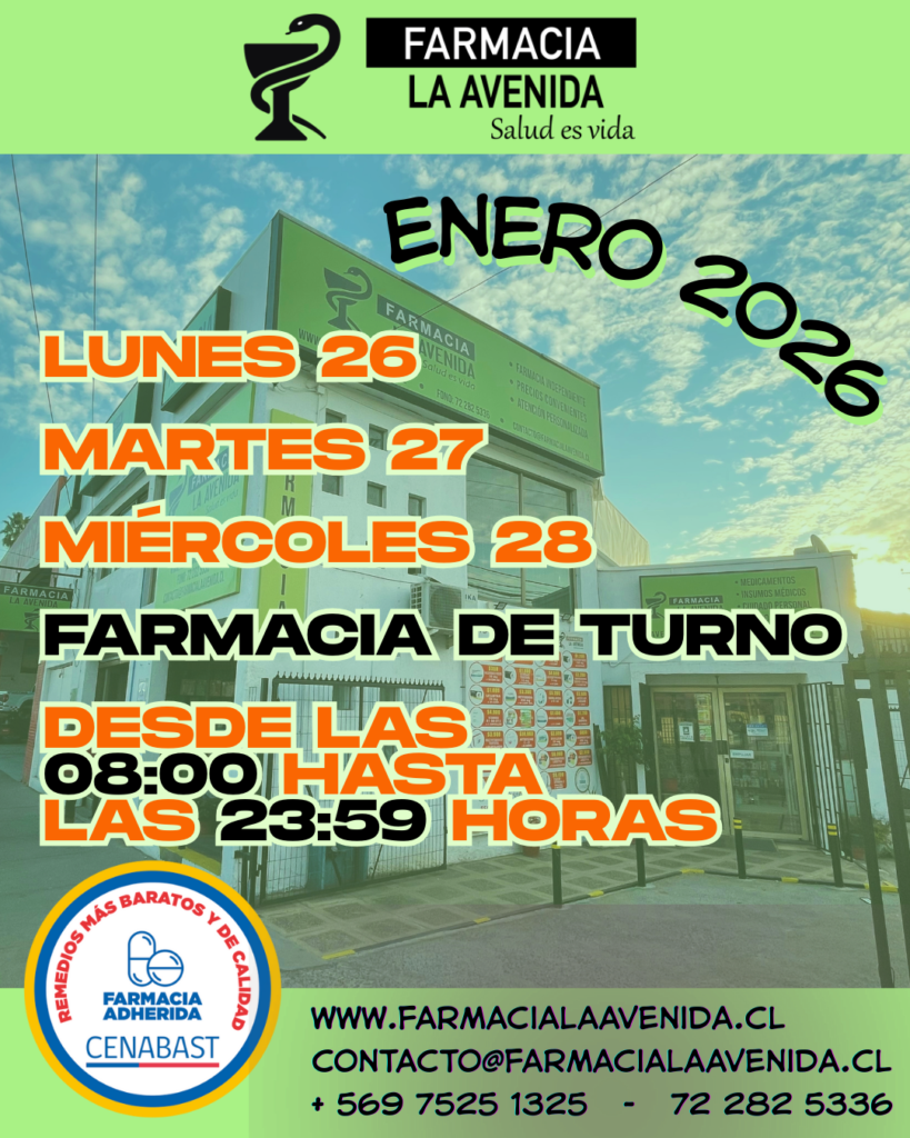 By Paula Navarro Claveria25 de Enero de 2026 Damos a conocer que durante los días lunes 26, martes 27 y miércoles 28 estaremos atendiendo en horario de Farmacia de turno para la comuna de Santa Cruz, es decir, iniciando a las 08:00 horas y terminando a las 23:59 horas del día indicado.
